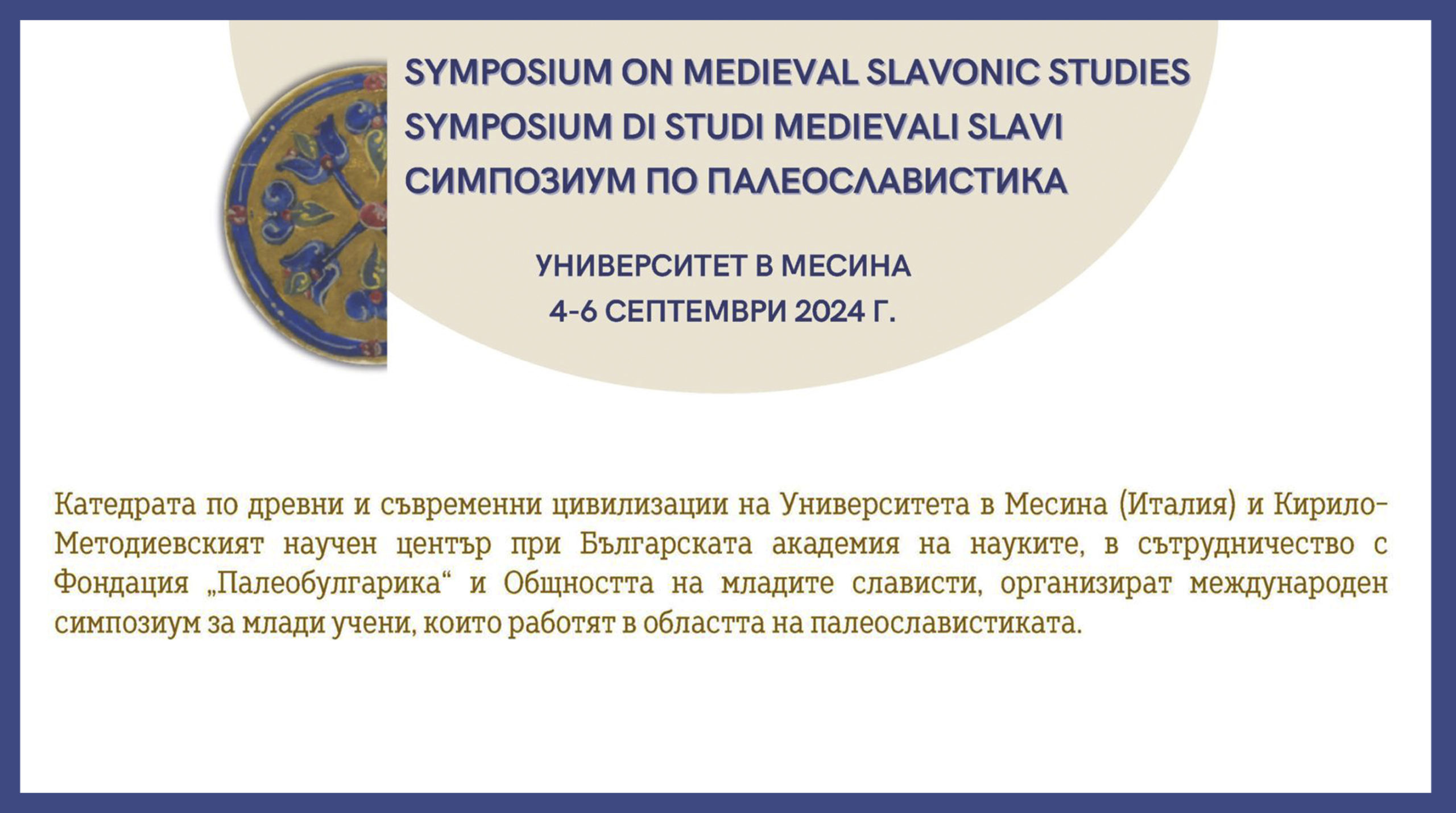 Катедрата по древни и съвременни цивилизации на Университета в Месина (Италия) и Кирило-Методиевският научен център при Българската академия на науките, в сътрудничество с Фондация „Палеобулгарика“ и Общността на младите слависти, организират международен симпозиум за млади учени, които работят в областта на палеославистиката.